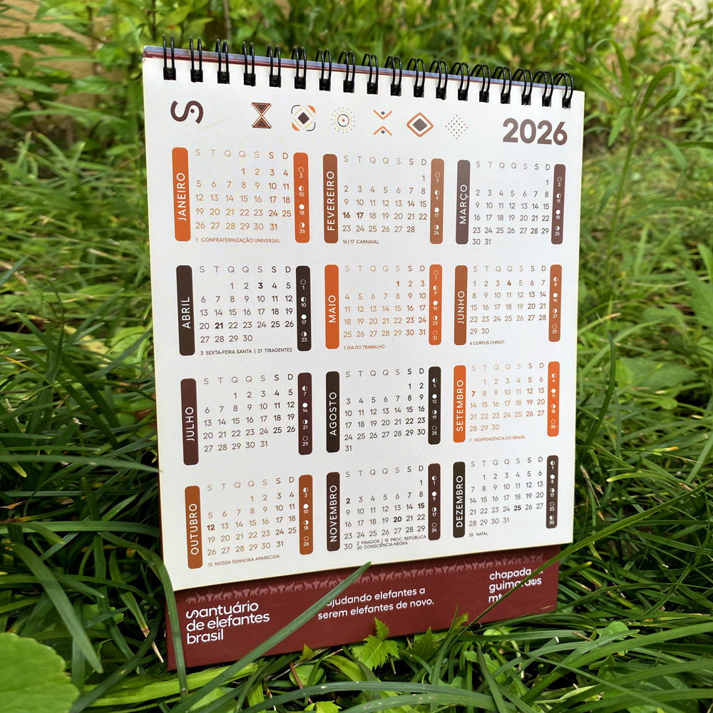 Este exclusivo calendário de mesa SEB 2026 traz a essência e a beleza do Santuário de Elefantes Brasil para seu ambiente de trabalho ou estudo. Com design sofisticado e funcional, esta peça não é apenas um item de papelaria de alta qualidade, mas também um símbolo do seu compromisso com o bem-estar destes magníficos animais que encontraram liberdade e dignidade no santuário.
